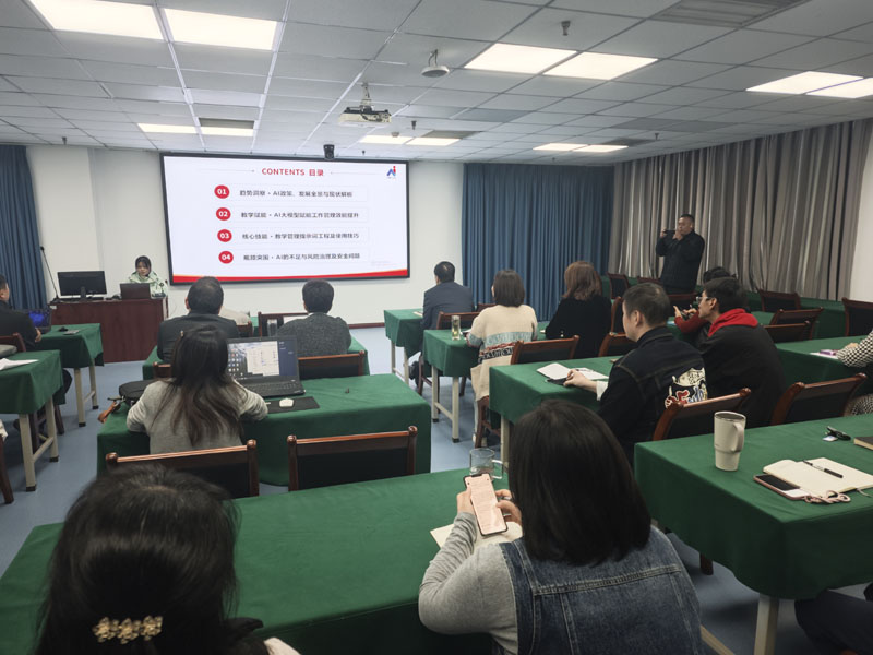 讲座内容主要围绕“AI政策、发展全景与现状解析”“AI大模型赋能工作管理效能提升”“教学管理提示词工程及使用技巧”“AI的不足与风险治理及安全”等四个方面展开,整场讲座内容兼具深度与实用性,案例鲜活、逻辑清晰,既有对技术趋势的前瞻性洞察,也有对实操方法的细致指导。