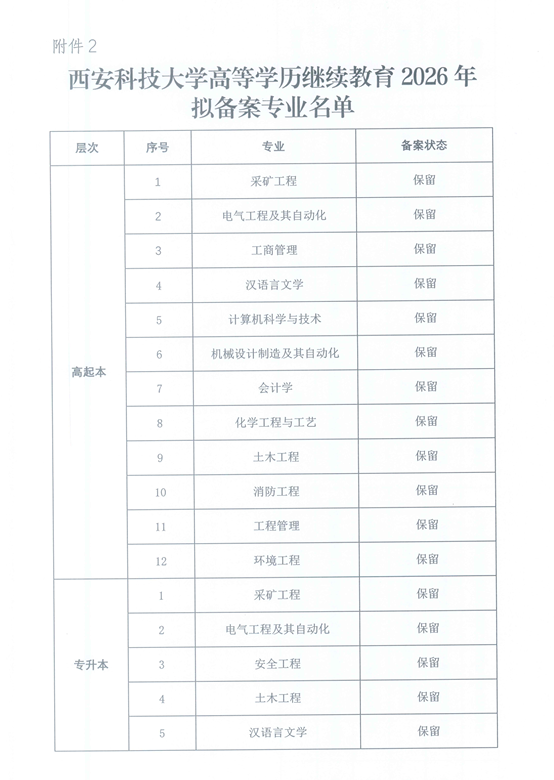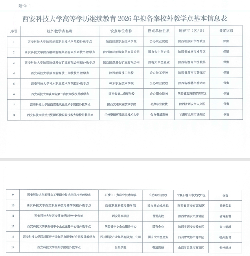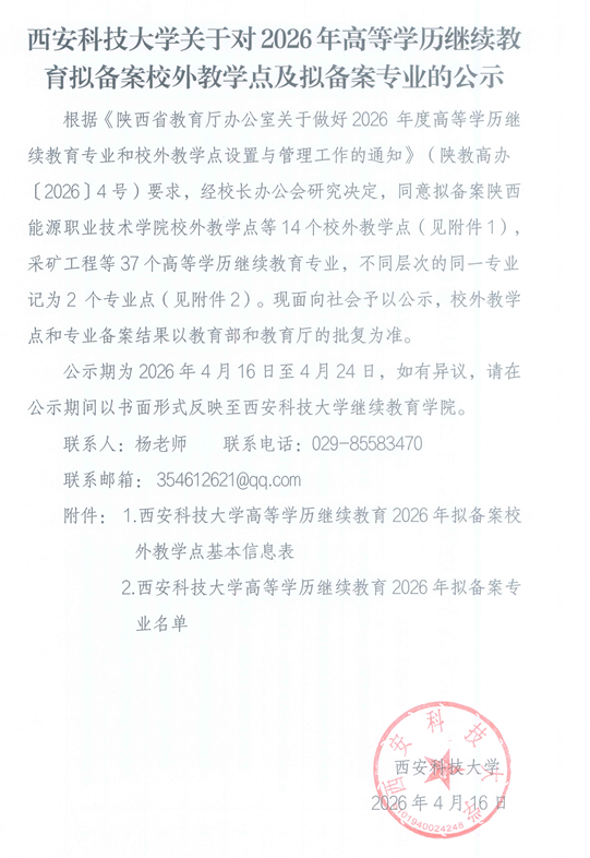 西安科技大学关于对2026年高等学历继续教育拟备案校外教学点及拟备案专业的公示