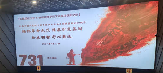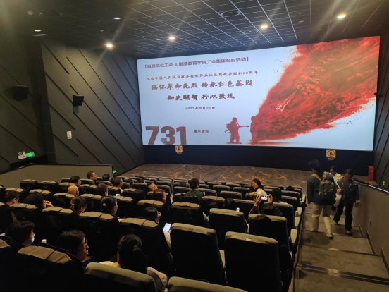 为纪念中国人民抗日战争暨世界反法西斯战争胜利80周年,深切缅怀革命先烈,传承伟大抗战精神,筑牢理想信念根基,9月25日下午,继续教育学院分工会举办了“以史为鉴强信念,勿忘国耻勇前行”主题观影活动,组织全院教职工集中观看了爱国主义教育影片《731》。